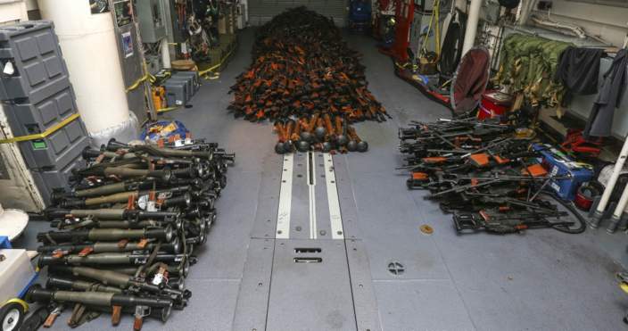 Grenade launchers, machine guns and nearly 2,000 assault rifles concealed under fishing nets were found by one of its warships, it added.