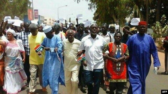 | FILE - Protesters are seen in this April 16, 2016 in Banjul following the death of an opposition figure. |