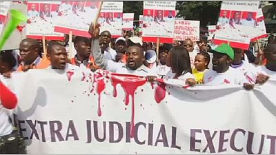 Demonstrators carried mock coffins and wore T-shirts smeared in red paint and emblazoned with slogan “stop police executions”.