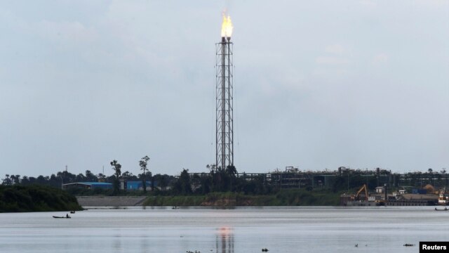 | A gas flare emits from an oil flow station near the village of Gbarantoru on the creek of river Nun, in Yenagoa in Nigeria's Delta region, May 18, 2016. |