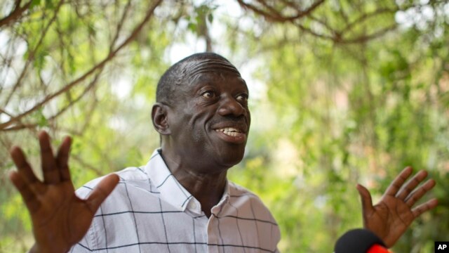 | FILE - Opposition leader and presidential candidate Kizza Besigye speaks to the media while under continued house arrest, at his home in Kasangati, outside Kampala, Feb. 21, 2016. A Ugandan judge freed Kizza Besigye on bail Tuesday, rejecting prosecutors' calls for him to be remanded indefinitely until his case is concluded. |